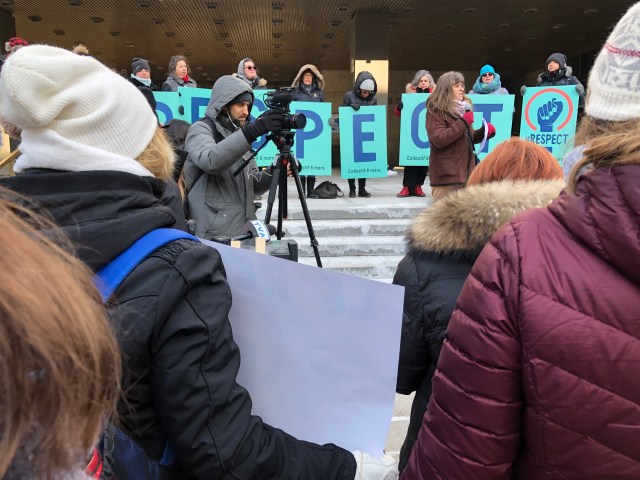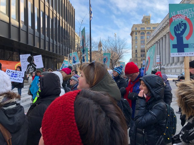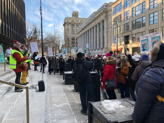Le vendredi 8 mars, la section locale 574 a répondu à l’appel de la Fédération des femmes du Québec en participant au rassemblement tenu devant le Palais de justice de Montréal où était attendu Gilbert Rozon dans le cadre de son audience pour une accusation de viol. Tout près d’une centaine de personnes ont scandé le slogan 2019 du Collectif 8 mars « Le respect, ça se manifeste« .
