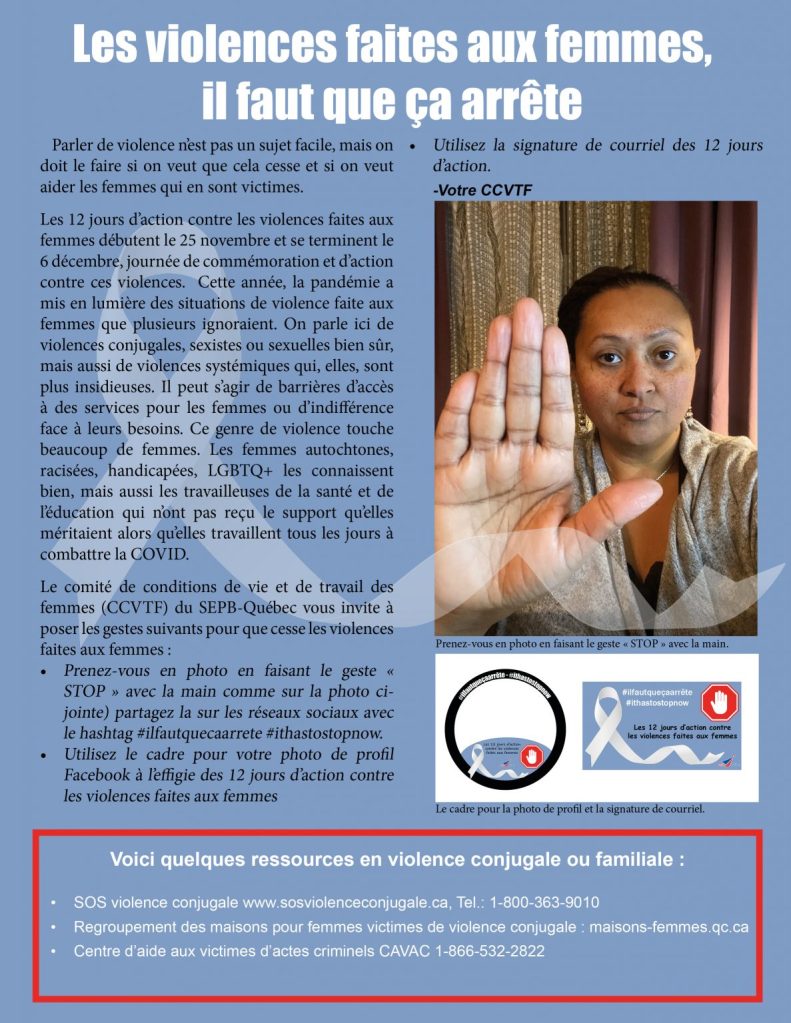 Le comité de conditions de vie et de travail des femmes (CCVTF) du SEPB-Québec nous invite à poser des gestes simples dans le cadre des 12 jours d’actions qui s’étendent du 25 novembre au 6 décembre 2020 pour que cesse toutes formes de violence que vivent les femmes.